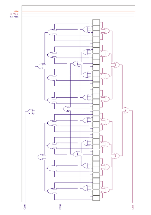 The second vector set accumulates the column information. With the FU-Regs Cells capturing the instruction operand read/write register numbers (in unary form), the ORing per column of those bits creates a "global picture", per register, of the fact that any Function Unit needs to read (or write) a particular Operand latch port.