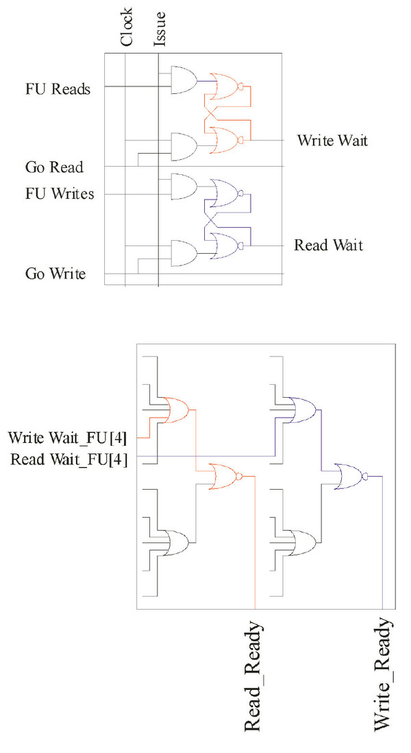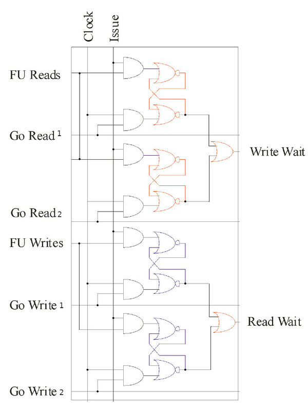 - Issue is LOW when CLK is HI. This is where the "defending" comes into play. There will be another Function Unit somewhere that has had its Issue line raised. This cell needs to know if there is a conflict (Read Hazard or Write Hazard).