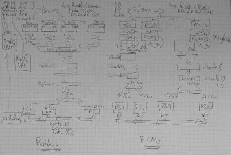 - secondly: those Matrices preserve time order (instruction dependent order actually), they are not themselves dependent on time itself. this is especially weird if one is used to an in-order system, which is very much critically dependent on "time" and on strict observance of how long results are going to take to get through a pipeline. we could do the entire design based around low-gate-count FSMs and it would still be absolutely fine.
