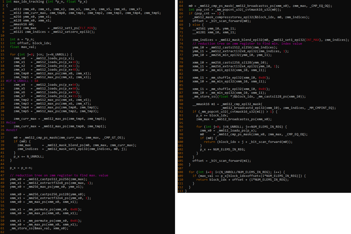 A variant on the c reference implementation allows for skipping of updating m (the largest value found so far), followed by always updating m whilst a batch of numbers is found that are (in their order of sequence) always continuously greater than all previous numbers. The algorithm therefore flips back and forth between "skip whilst smaller" and "update whilst bigger", only updating the index during "bigger" sequences. This is key later when doing SVP64 assembler.